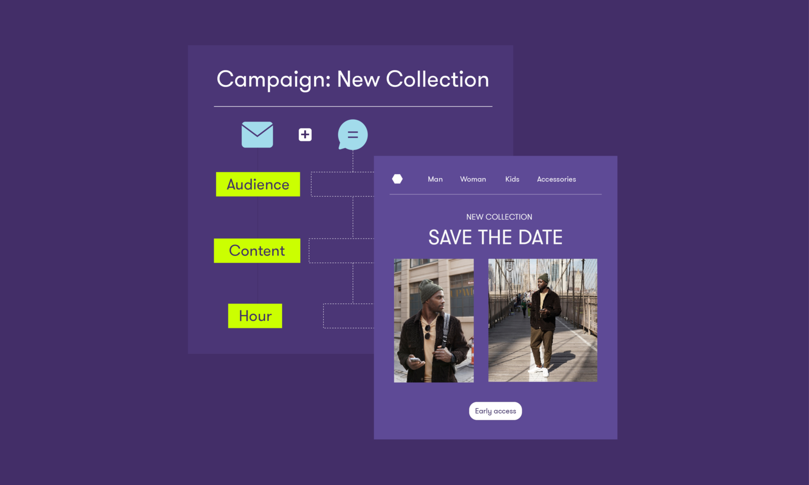Imagine an online store launching a new fashion collection, aiming to increase visibility, foster initial purchases, and maximize sales in the first weekend. Here’s a possible strategy for integrating email and SMS in 3 phases to ensure customers receive consistent and complementary messages at different times.